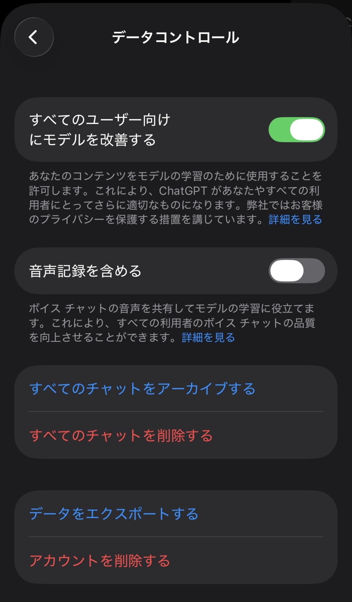 データコントロールでは、「トレーニング(改善目的)に使うか」を切り替える設定があります。