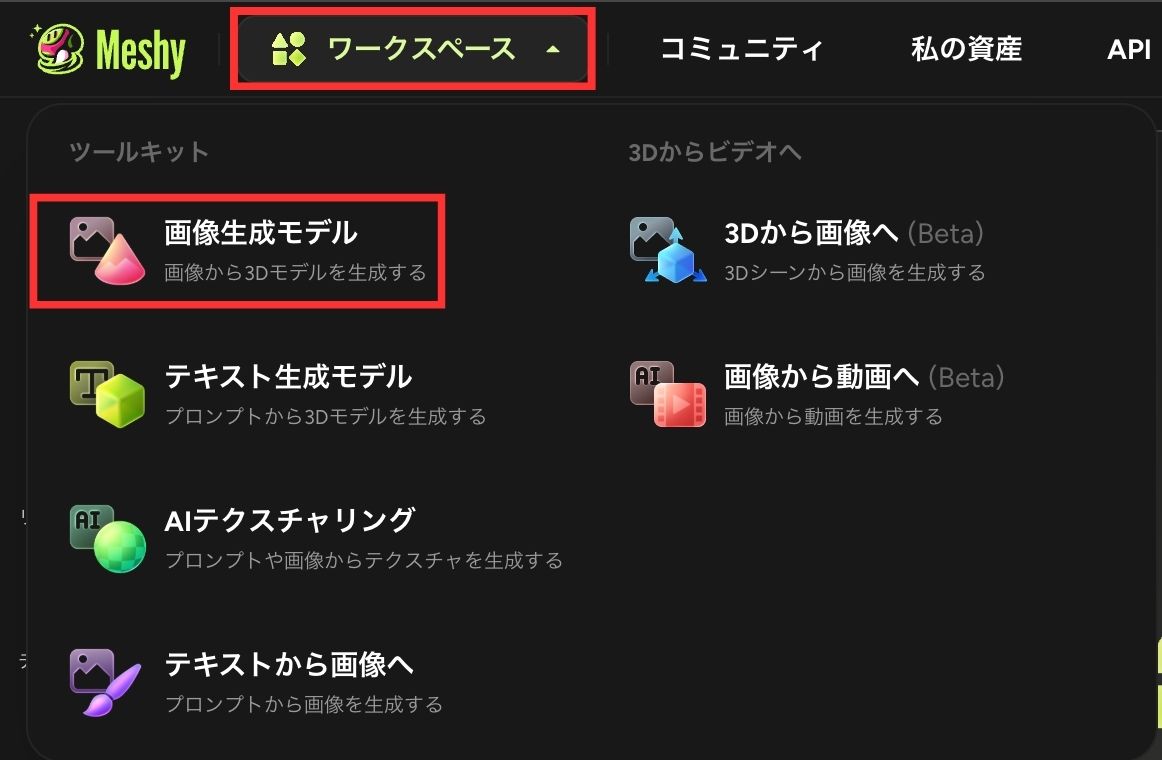 Meshyにログインしたら、上部メニューの「ワークスペース」を開きます。