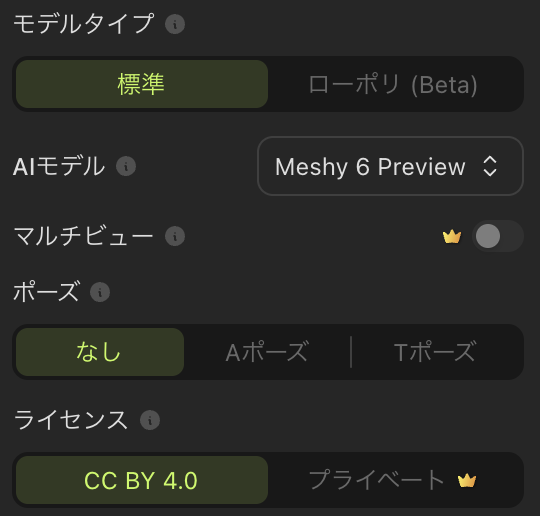 AIモデル:表示されているもの(例:Meshy 6 Preview)のままで問題ありません