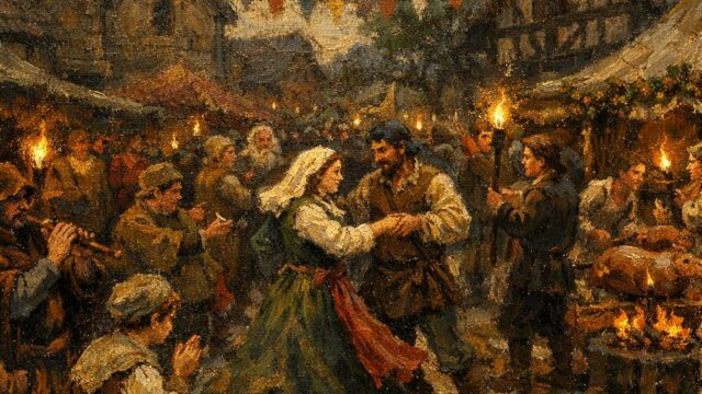 〔主題:祝祭の広場〕。中世ヨーロッパの生活。木造と石造、手縫いの衣服、自然素材。光は弱い日照、松明と蝋燭の揺れる光。現代要素なし。絵画風。