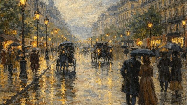 〔主題:雨上がりの大通り〕。19世紀末パリ。石畳、ガス灯、馬車、石造ファサード。中産階級のコートと帽子。印象派の外光表現、反射と霞。現代要素なし。
