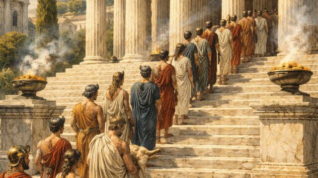 〔主題:列柱の神殿前の行列〕。古代地中海世界。石材、彫刻的な衣文、乾いた強い光。整然とした構図、装飾は控えめ。現代要素なし。絵画風。