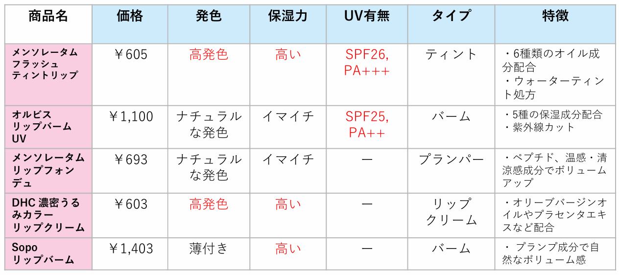 UVカットできるのは、メンソレータム フラッシュティントリップ(SPF26・PA+++)とオルビスリップバーム UV(SPF25・PA++)の2つ。