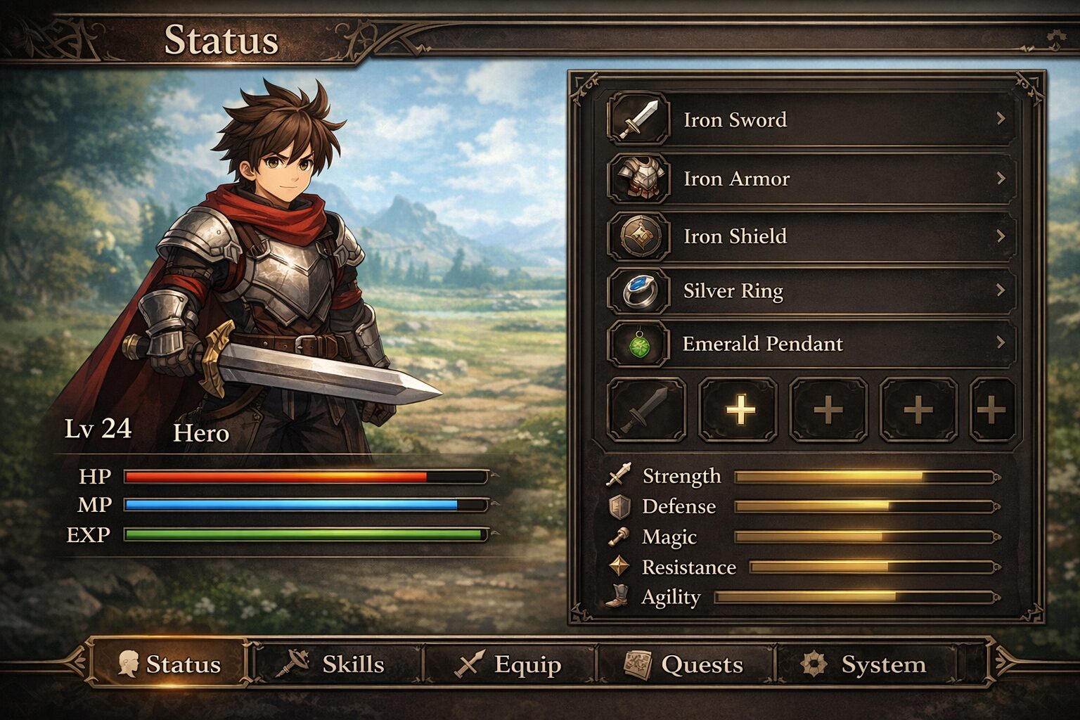RPGのステータスメニュー画面。キャラクター立ち絵と装備スロット、数値は抽象的なバー表現。