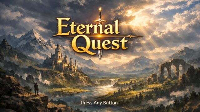 ファンタジーRPGのタイトル画面。壮大な風景とロゴ風タイトル配置。