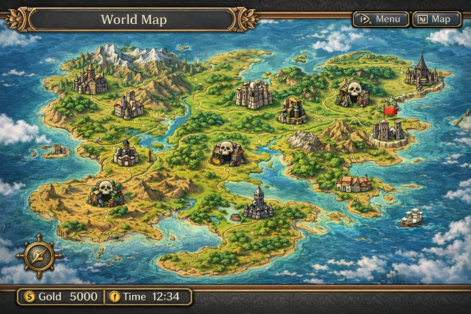大陸全体を俯瞰視点で表示し、街やダンジョンはアイコン表現。