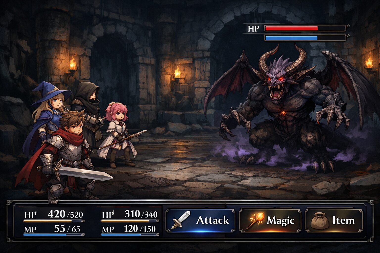 本記事では、RPGの「キャラ絵」ではなく、HPバーやコマンド枠などのUIを含む“ゲーム画面風”の画像をChatGPTで生成する方法を紹介します。