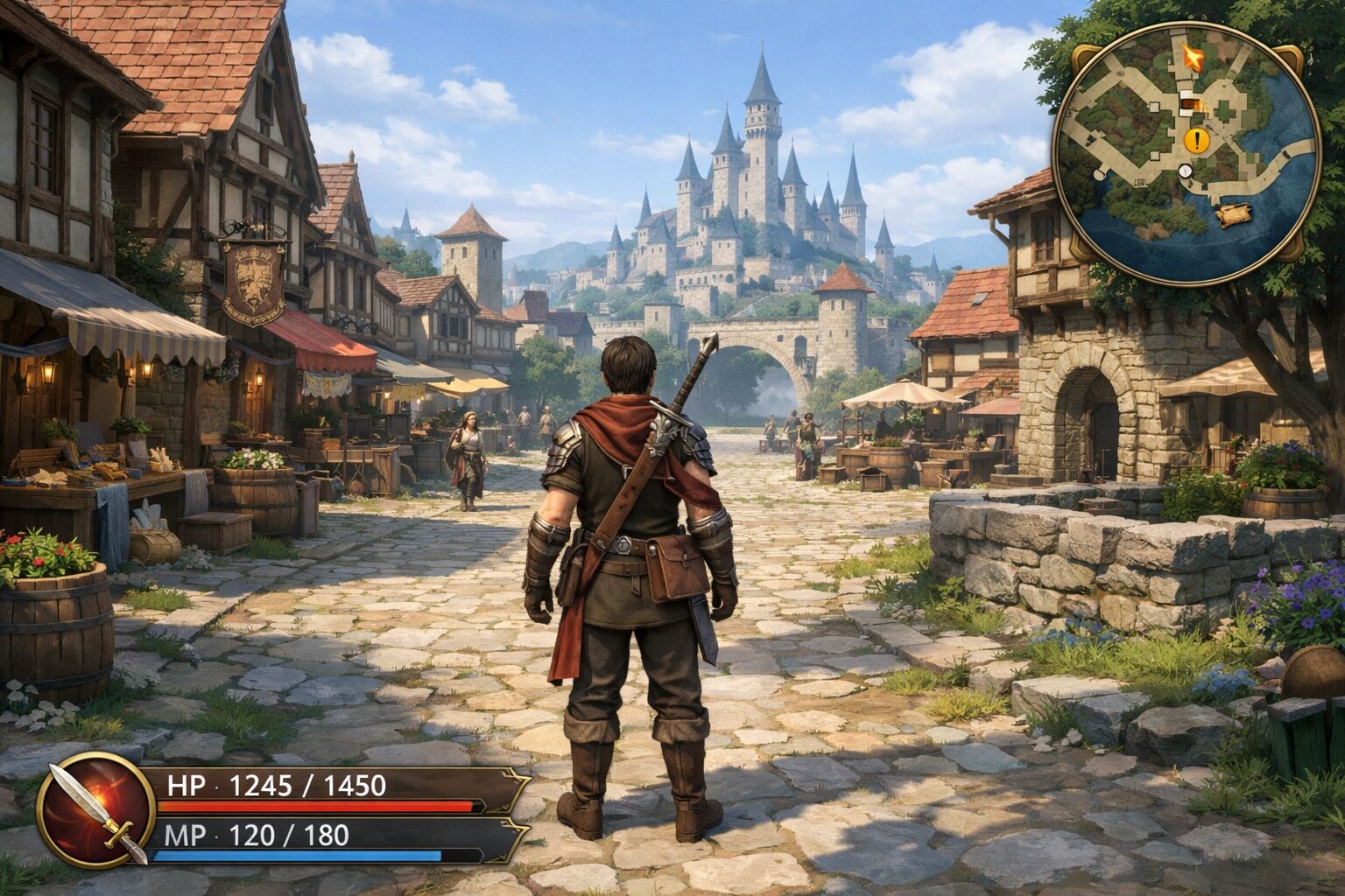 中世風の街並みを背景に、画面中央にプレイヤーキャラクター。