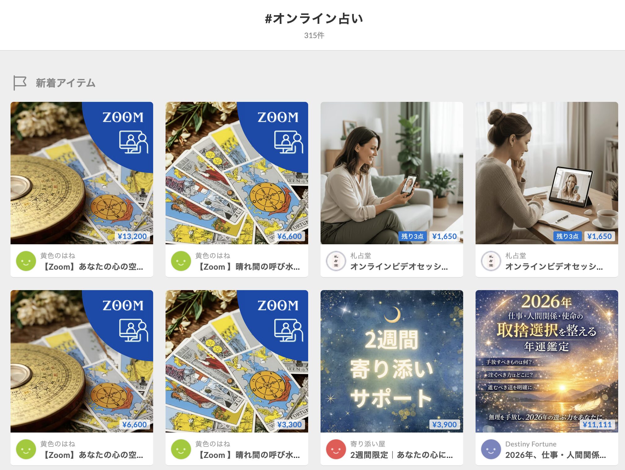 また、個人がネットショップを作れるSTORESでも「オンライン占い」関連の商品が多数販売されています。